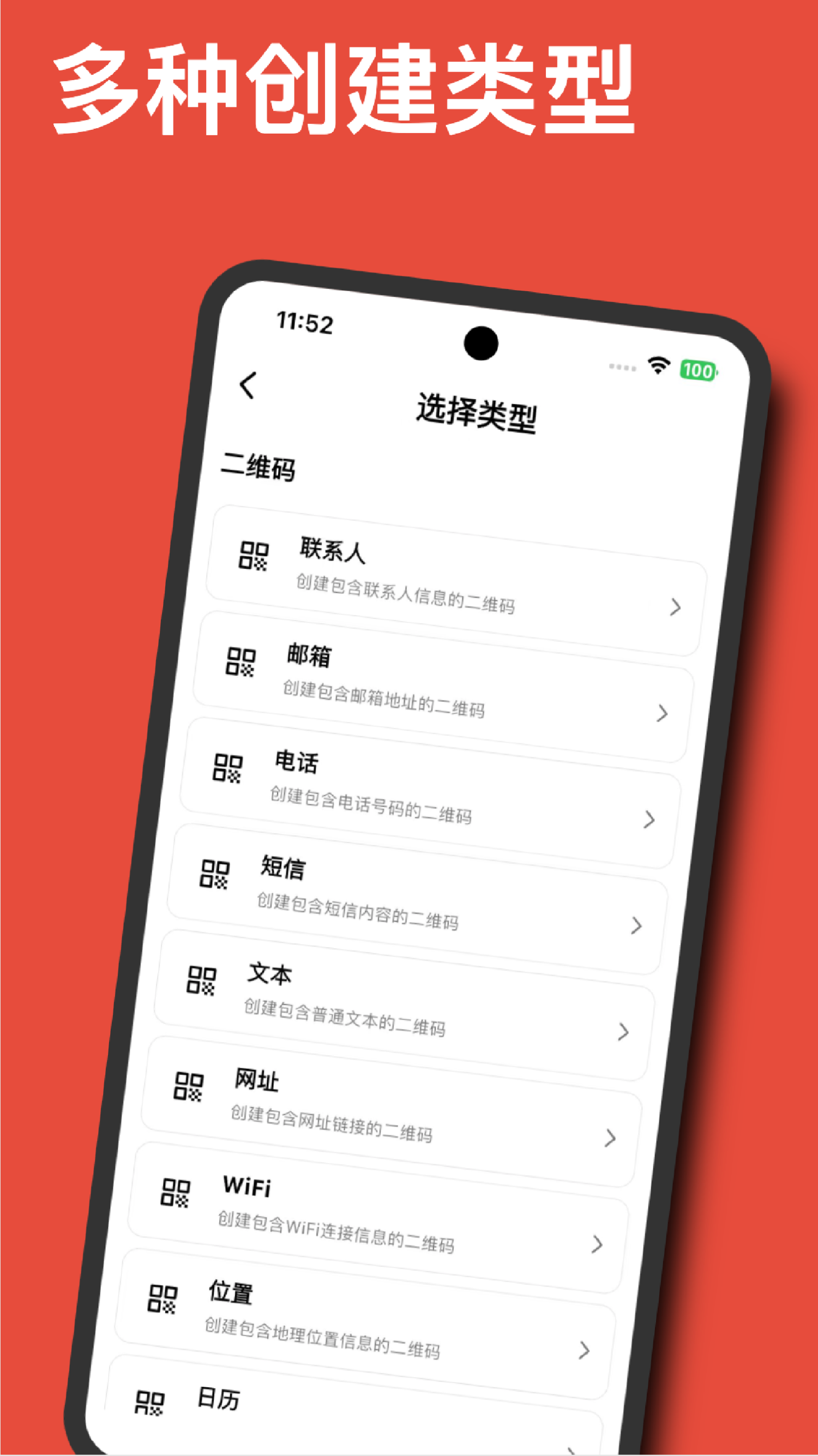 支持文本、网址、WiFi、联系人等多种类型的二维码生成。